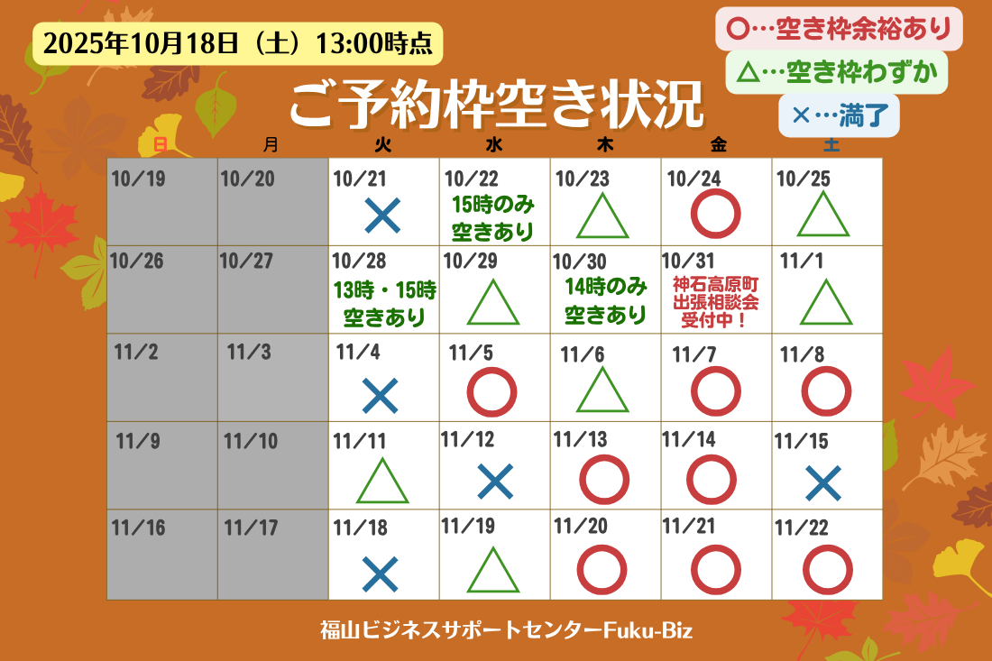現在のご予約枠空き状況をお知らせいたします(10月18日時点)。初めてフクビズへの相談を検討されている方は、ぜひご参考ください。
