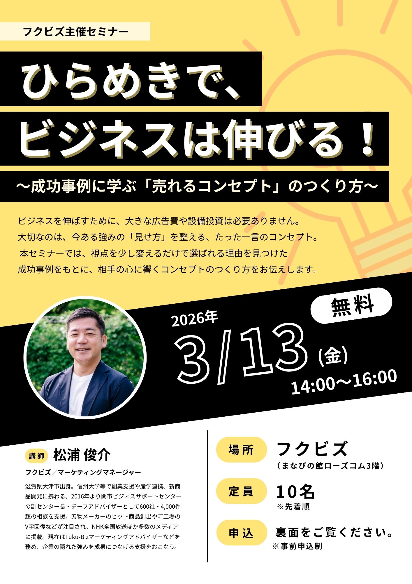 3月13日(金)、フクビズ主催の無料プチセミナー「ひらめきで、ビジネスは伸びる!~成功事例に学ぶ『売れるコンセプト』のつくり方~」を開催します!