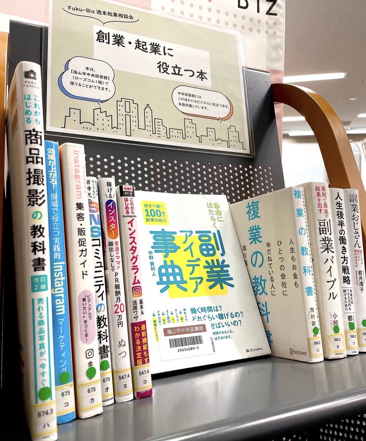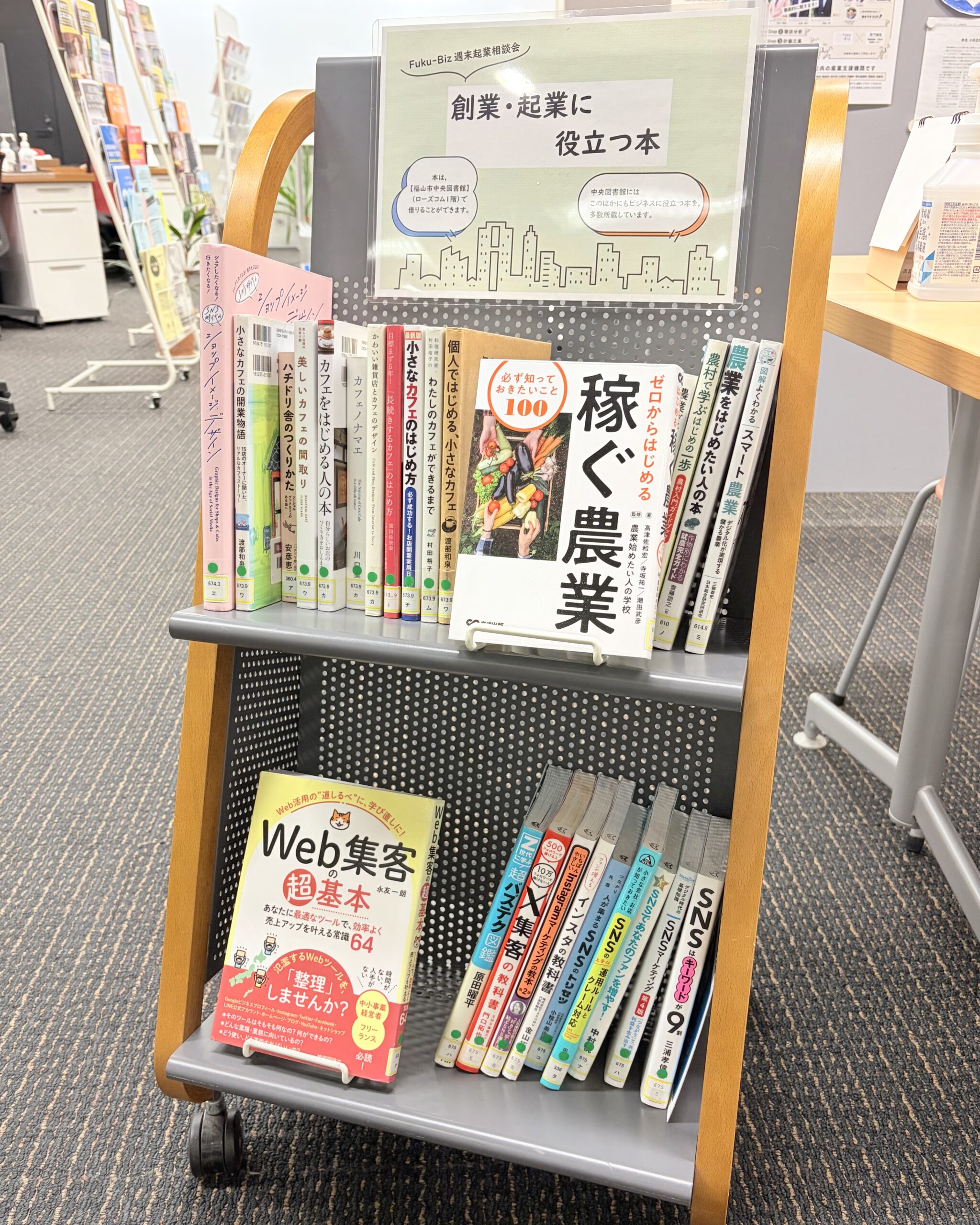 当日は、お越しいただく方の事業や相談内容に合わせて、福山中央図書館の司書の方に選んでいただいたビジネス本をフクビズ内に設置します。