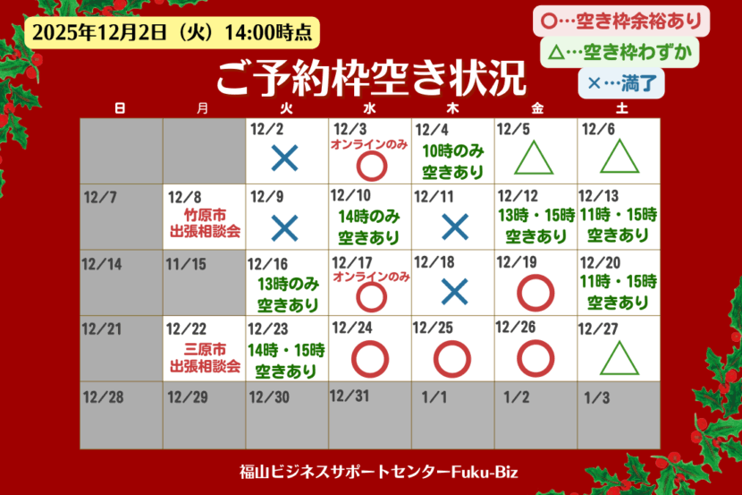12月のご予約枠空き状況をお知らせいたします(12月2日時点)。初めてフクビズへの相談を検討されてい […]